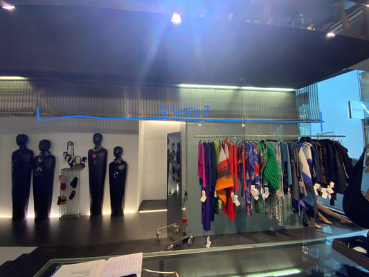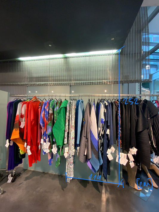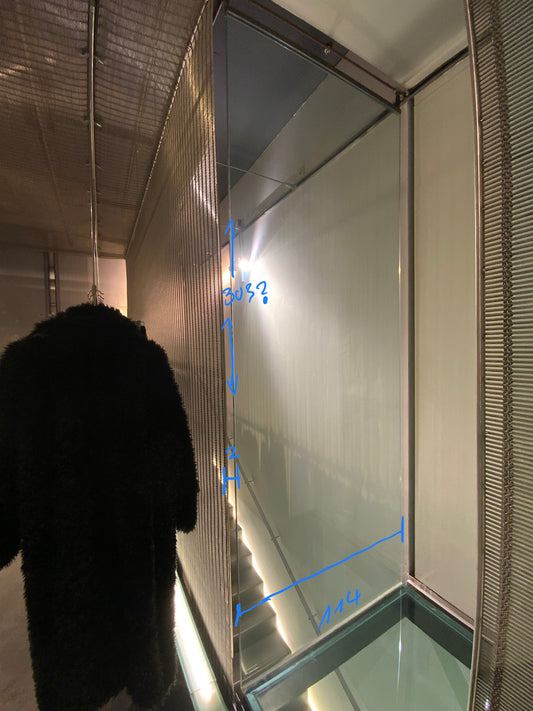 Ein Stuttgarter Bekleidungsgeschäft zieht um. Zurück bleibt die exklusive Innenausstattung aus dem Jahr 1997. Darunter hochwertiges Metallgewebe des Herstellers GKD-Gebr.-Kufferath GmbH & Co. KG und Glasscheiben in verschiedenen Größen.
