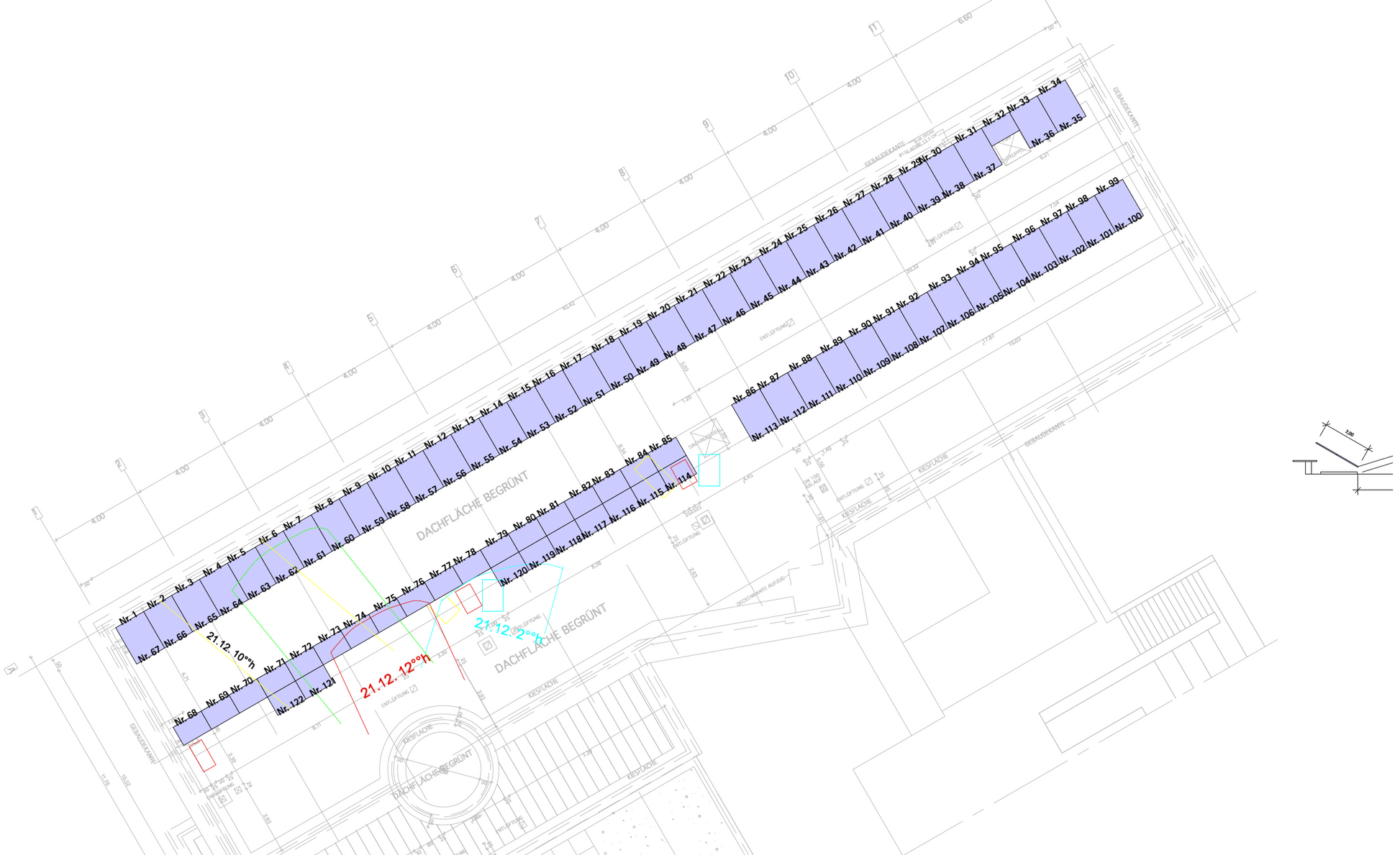 Azur Solar Module mit je 160 W inklusive Unterkonstruktion als Flachdachgestell mit 30° Neigung (jeweils zwei Module übereinander montiert).